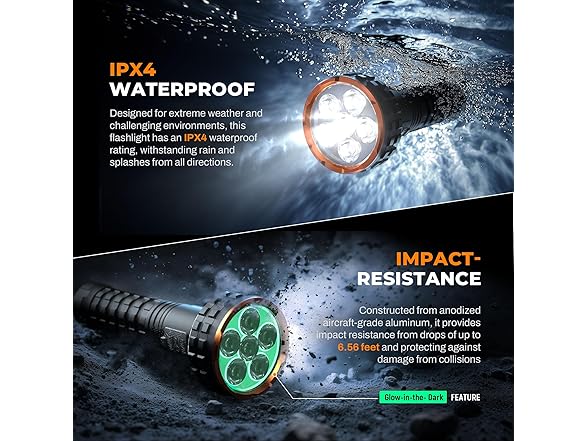 - 【IPX4 Waterproof & Impact-Resistant】Engineered for harsh weather and rugged environments, this flashlight boasts an IPX4 waterproof rating, ensuring reliable performance under rain or splashing water from any direction. Constructed with anodized aircraft-grade aluminum, it offers superior impact resistance, surviving drops from up to 2 meters (6.56 feet). Ideal for outdoor adventures, camping, or emergency situations, it provides consistent illumination without compromising ruggedness. so you can confidently navigate through rain or rough conditions without worrying about equipment failure