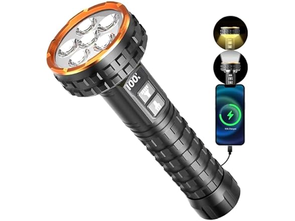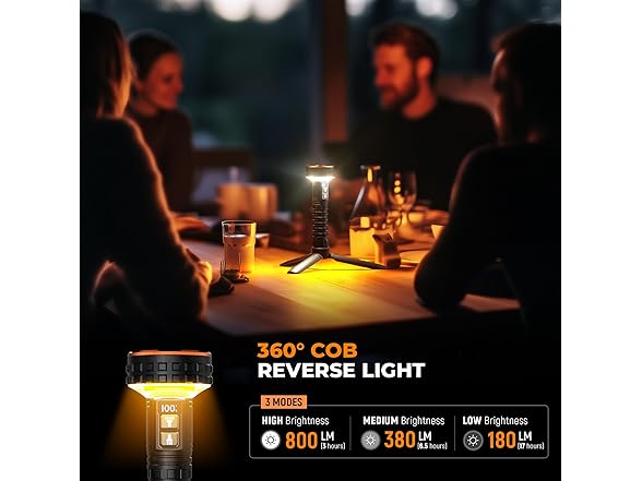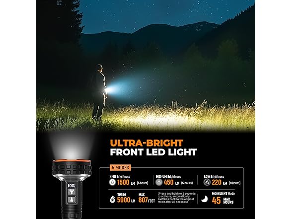 - 【5000 Lumens Dual Light Source Flashlight】This dual light source flashlight features ultra-bright front LEDs and an upgraded 360° COB reverse light, delivering up to 5000 lumens. In turbo mode, it illuminates up to 807 feet(246 meters), easily cutting through dust, fog, and darkness. The front LEDs are ideal for long-range lighting during hiking, night trekking, or outdoor activities. Meanwhile, the 3600K COB reverse light provides a soft, even glow, creating a cozy atmosphere in tents, especially in foggy or rainy conditions.