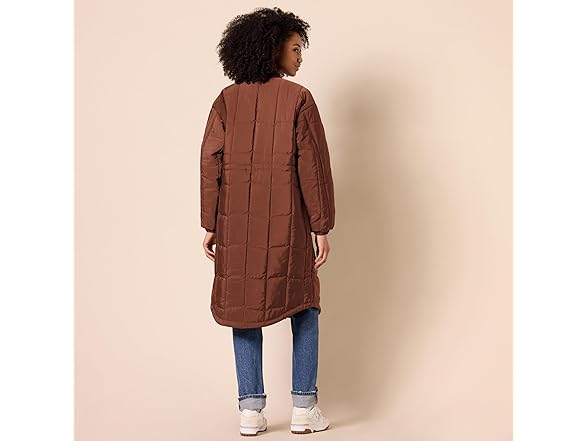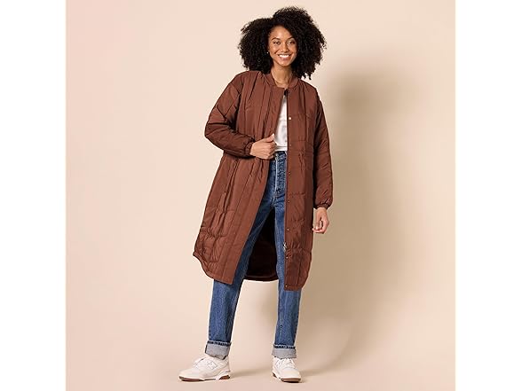 - QUILTED COAT: Fully lined with medium weight insulation, this must-have outerwear jacket can be cinched to accentuate your waist or worn uncinched for a relaxed look. Dropped shoulders and subtle A-line shape at the hem. Style back to our matching Amazon Essentials Leggings for a fresh, head to toe look.