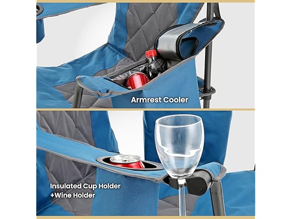 - Equipped with an armrest-mounted built-in cooler pouch that holds up to six standard-size beverage cans for convenient refreshment at your side.