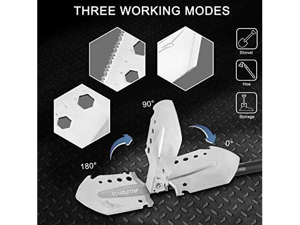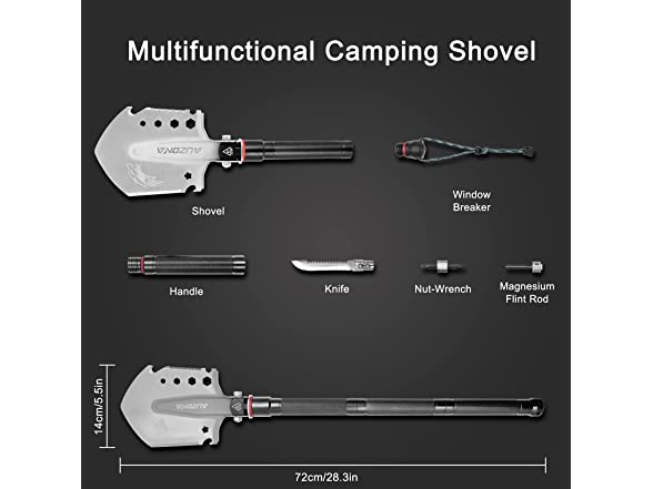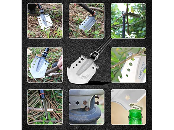- Multifunctional Shovel: Auzona Tactical Shovel supports more than 20 functions such as shovel, digging, pry, hoeing, sawing, cutting, hammering, shearing, scraping, chopping, sparking, bottle opener, broken window and more. It is a reliable companion for outdoor travel.