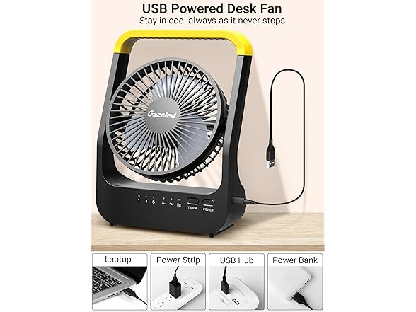 Strong but Quiet Desk Fan: This small but powerful desk fan has 3 speed settings and you can choose the airflow at your preference. The wind is very large owing to our newly designed motor. It also lowers the noise to 50dB. Portable Fan with Timer: The timer feature allows you to turn off the fan after some time. The timer can be 1, 3 or 5 hours. No need to wake up to turn off this quiet fan. USB Desk Fan & Battery Fan: This 5 inch desk fan works with 4 D-cell batteries (not included) or it can be powered by USB cable, which is ideal for camping, travel, power outages and emergency needs. Note: it is also compatible with carbon D battery, alkaline D battery or rechargeable NiMH battery. Rotation and Portability: The 180° rotation design lets you take the fresh air directly to your face and get cool instantly. With the built-in handle, it is easy to carry it around. Great for travel, camping and other outdoor activities use. 100% Satisfaction Guaranteed: This USB desk fan comes with a USB cable that can be used when connected to a power bank, car charger, computer, or a 5V wall USB charger. We also offer one year warranty for this small portable fan. If you have any questions, feel free to contact us through Amazon. We will provide free replacements or a full refund.