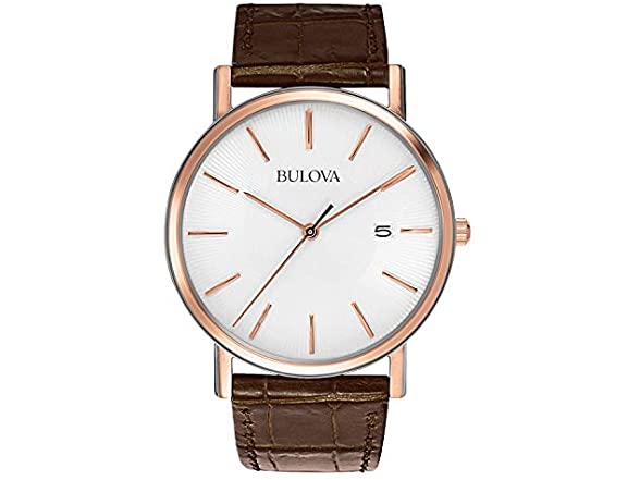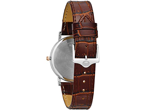 A clean traditional timepiece from Bulova. Brown croc-embossed leather strap and rose-colored stainless steel case. Minimalist white dial with logo and thin rose-colored indexes and indicators. Quartz movement. Water resistant 30 meters. Case 37mm.