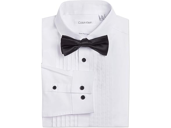 Calvin Klein Boys' Long Sleeve Tuxedo Dress Shirt with Bow Tie, Button-Down Style with Classic Pleated Bib, Includes Matching Hanky, White, 8