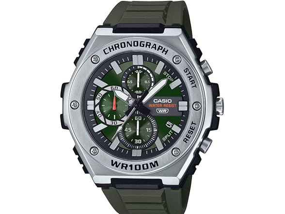 The Casio MWA300H-1AV Men’s Analog Watch combines a bold chronograph-inspired design with everyday practicality, making it a reliable timepiece for casual wear, work, and outdoor activities. Featuring a stainless steel bezel with hairline and mirror finishes, this watch delivers a sleek yet rugged look, perfect for those who appreciate both style and durability. The raised indexes, inset dials, and sporty accents create a striking aesthetic, while the resin band provides a comfortable and secure fit for all-day wear. Designed for versatility, the MWA300H-1AV is water-resistant up to 100 meters (330 feet), making it suitable for swimming, sports, and everyday exposure to moisture. The integrated 1/10-second stopwatch with elapsed, split, and first/second place timing ensures precision, while the three sub-dials track stopwatch minutes, seconds, and 1/10 seconds for added convenience. The large analog display with bold hour markers and luminous hands ensures clear readability in various lighting conditions, making it easy to check the time at a glance. The date display at the 3 o’clock position provides quick reference to the current date, making this watch a practical choice for those who need a timepiece that keeps them on schedule. Powered by a long-lasting SR920SW battery, the MWA300H-1AV offers up to 3 years of operation, minimizing maintenance. The quartz movement ensures precise timekeeping, with an accuracy of ±20 seconds per month, making it a dependable choice for everyday use. Whether you’re looking for a rugged yet stylish watch for daily wear, a reliable sports accessory, or a functional timepiece with stopwatch capabilities, the Casio MWA300H-1AV delivers durability, style, and performance in a modern design.