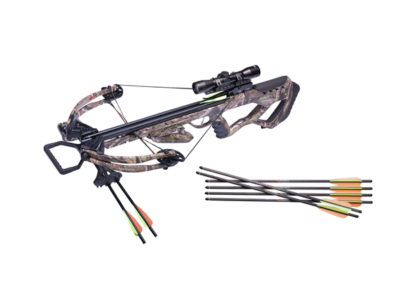 - Included in package: three 20" bolts, 4x32 mm scope, quiver and rope cocker.