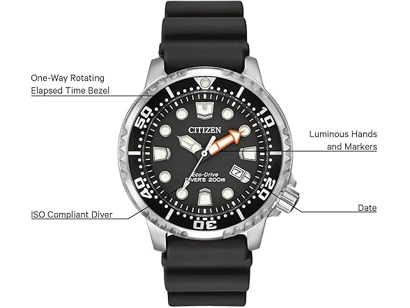 Citizen Promaster Dive Eco-Drive Watch, 3-Hand Date, ISO Certified, Luminous Hands and Markers, Rotating Bezel