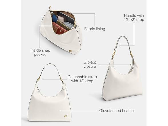 - It's All in the Details: Glovetanned leather, inside snap pocket, zip-top closure, fabric lining, handle with 12 1/2" drop, detachable strap with 12" drop. 15" L x 15" H x 5 1/4" W