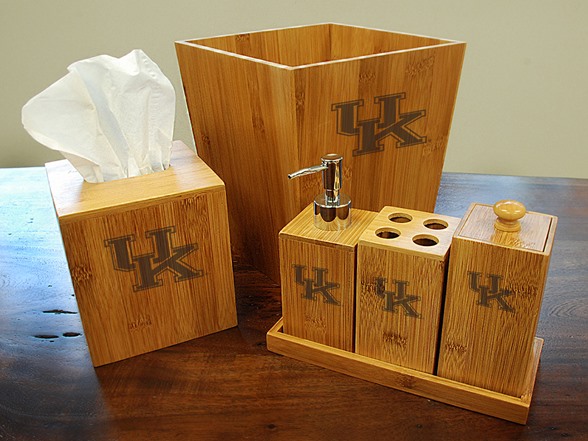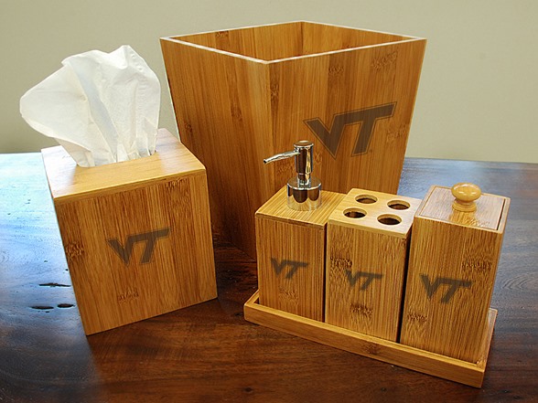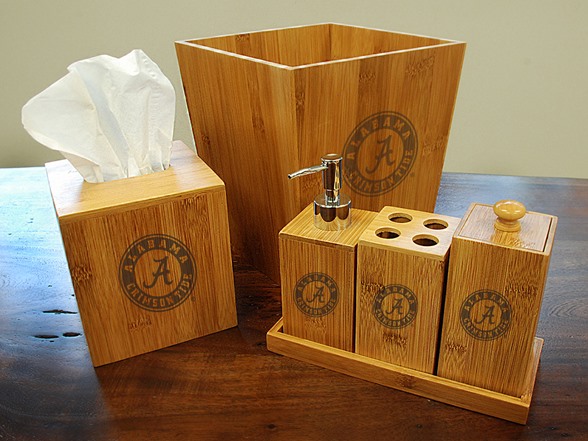 This 100% bamboo bathroom set features six pieces: trash can, tissue cover, tray, toothbrush holder, soap dispenser and cotton ball holder with natural finish team logo engraved.