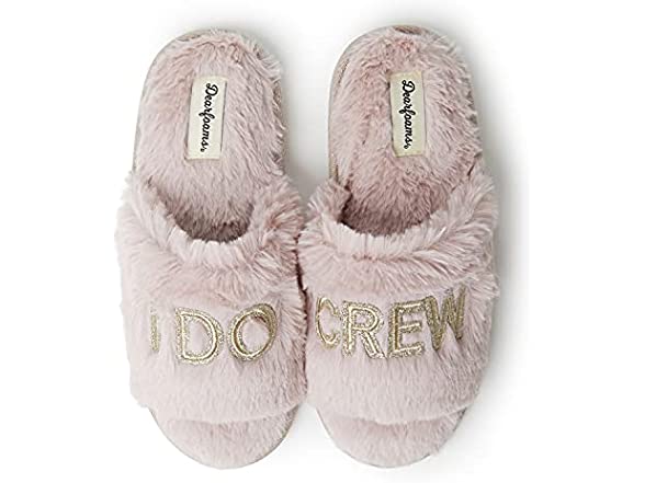 - SLIDE-ON DESIGN: Dearfoams Bridal Slide-On Slippers are cute, cozy, comfortable and sure to put a smile on your face. These slippers are perfect for you and your crew to slide-on before the big day!