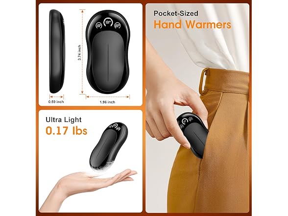 【6000mAh Battery & Ultra-Portable Design】Never worry about power with a massive 6000mAh battery providing up to 20 hours of warmth for all-day outdoor use. Despite the robust capacity, each warmer is remarkably slim (0.59 inches) and lightweight (0.17 lbs). They fit discreetly in the palm of your hand, slip seamlessly into gloves, or rest comfortably in your pocket without any bulk, ensuring warmth is always within reach. The sleek design makes them ideal as Christmas stocking stuffers.