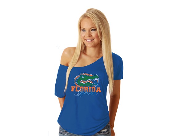 This off the shoulder lightweight drape tee is sure to turn heads not just on game day but every day, a definite must have piece in your closet. Soft touch fabric feels very comfy against body.