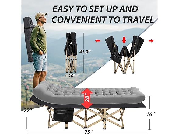 - 【Easy Folding 】Our portable bed require no complicated installation and can be easily folded and installed in seconds for great convenience. The cots for camping measures approximately 41.3 "L x 10" W and weighs only 13.23 pounds, making it compact and easy to carry and store, helping you travel light.Quick setup helps you save more time to relax or explore nature.