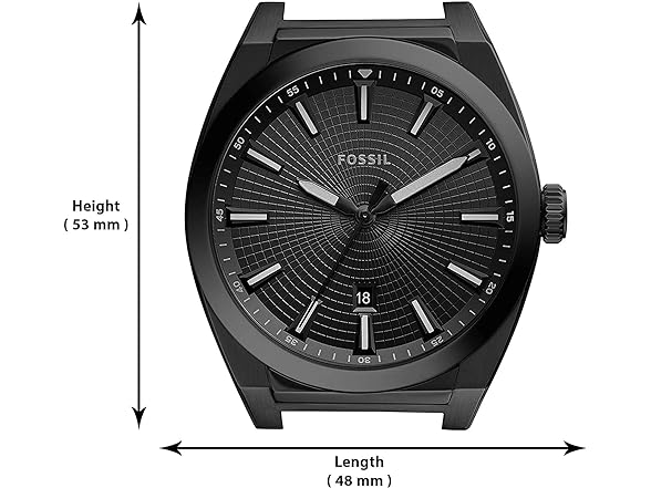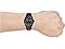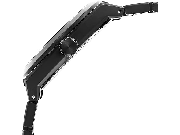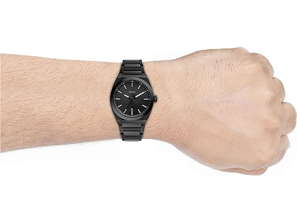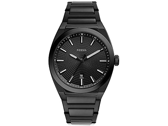 - Black stainless steel case with black textured dial; black stainless steel bracelet band; links can be removed for a customized fit