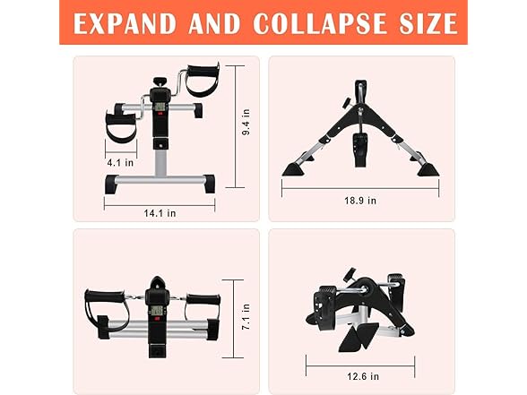 - and#12304;MAXIMUM CONVENIENTand#12305;The leg foldable design of the foot pedal exerciser makes it effortless to carry and store. The folded size is 13.9 x 12.6 x 7.1"es and the weight is only 5 pounds. Suitable for installing under a desk(exceeds 47"es), beside a sofa or similar space, requiring little storage space.