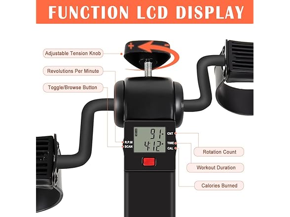 - and#12304;MULTIFUNCTIONAL LCD DISPLAYand#12305;GOREDI stationary pedal exerciser is equipped with a large and easy-to-read multi-functional digital LCD display, which can track time, count, RPM and calories burned. Each data can be automatically displayed alternately by scanning function.