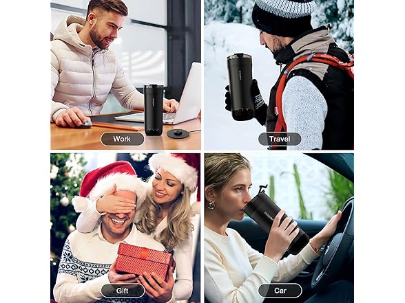 - 【Smart Heating, Anywhere】This heated travel mug maintains hot coffee, tea, or beverages at 120°F–150°F for 4 hours. Includes car charger and desktop base for continuous warmth. The heated coffee travel mug rechargeable design ensures optimal temperature during commute, road trips, or office use. Perfect as a smart travel mug for active lifestyles.