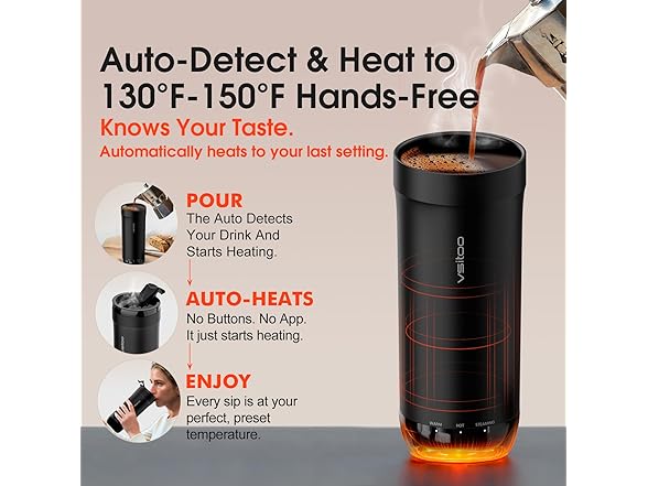 - 【AI Auto-Heating & Intelligent Control】The AI sensor automatically detects your drink and begins heating. You can also control this temperature control smart mug travel via Vsitoo app or one-touch button. This self heating travel mug provides effortless operation, making it an ideal hot coffee travel mug for daily use.