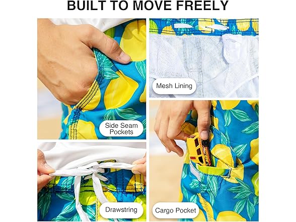 • Side Seam Pockets in these swimming trunks for boys give plenty of options for storage