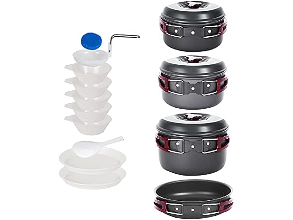 - IDEAL FOR 5-6 PERSONS USING: This cookware set including 3pcs pots with lids, 1pc frying pan, 1pc foldable ladle, 1pc spoon, 5pcs bowls, 2pcs plates and 1pc cleaning sponge, which can satisfy 5-6 persons in outdoor use. All the items can be put into a carry bag for easy store.