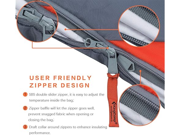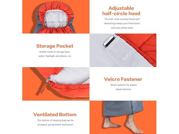 - ADDITIONAL SPECIAL DESIGN TO KEEP WARM - The zipper baffle makes the zipper works well and a Velcro fastener adds fastness of zipper; With two-way separating zip on one side for easy access; An additional zipper at the bottom where you can unzip your feet without unzipping the whole bag if you get too warm/hot; Two straps at the bottom of sleeping bag are convenient to hang if needed. The adjustable half-circle hood with drawstrings envelopes your head in warmth.
