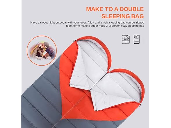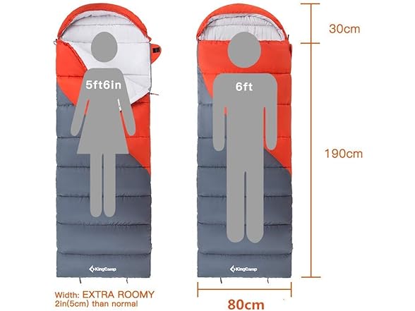- CONVENTIBLE SLEEPING BAG - This Adult sleeping bag measures (74.8+11.8) x 31.4 in, allows a suggested max user height of 7ft; The double zipper design makes it possible to zip a left and a right sleeping bag to make a queen size bag. so that you can snuggle up with your partner when you're sleeping under the stars in the great outdoors.