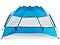 - New Version: Extra large beach tent with a extended floor, providing a good place to rest and playing games. You can also hang it on the front porch and use it as a dressing room for convenience and privacy. POP UP automatically in a second. Upgrade stronger and larger HUB connector and fiberglass make this sun shelter more stable and durable. Compared to other sun shade use drawstrings, this sun shelter create a cool space for your family without any effort. Super easy up and down.
