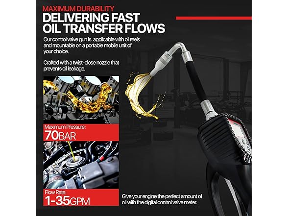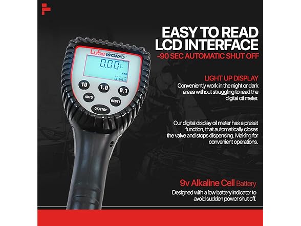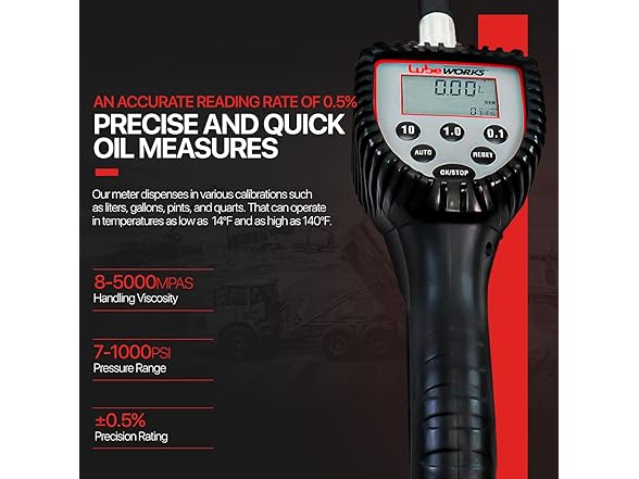 - VALVE SPECS - This Lubeworks Preset Digital Control Valve has a Max Flow rate of 10GPM / 35LPM, at a precision of ±0.5%, handling Viscosity of 8-5000mPas, a Max Pressure Range of 7Mpa 0.5-50BAR / 7-1000PSI; An Inlet Connection of 1/2" inch Npt Female connecting to industry-standard oil hose reels; battery-powered w/ 1x Alkaline Cell 9v Battery, altogether weighing 3.3 lbs, including the Digital Preset LCD Meter and Flexible Spout