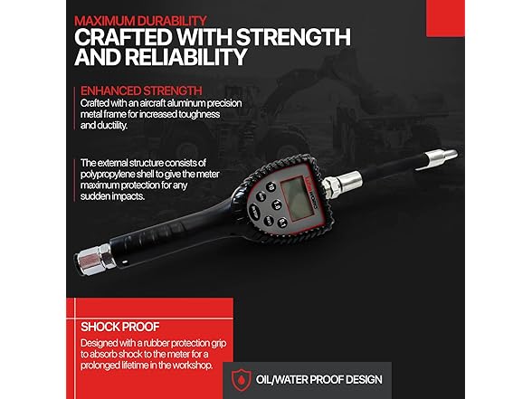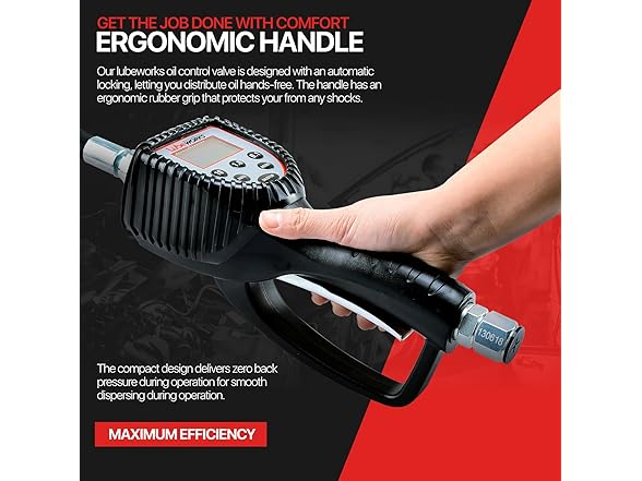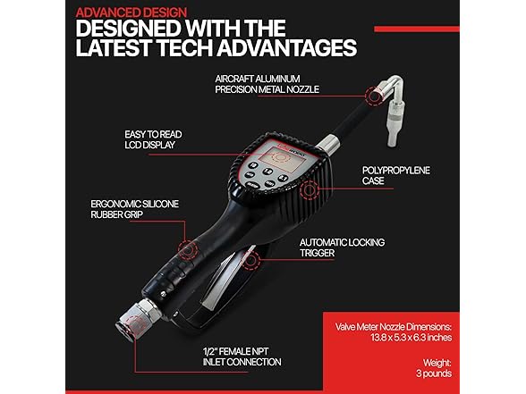 - EFFICIENT and SUPERIOR - This Preset LCD Digital Meter Control Valve has a 4-digit easy to read screen, low battery indicator to avoid sudden shut-off, can measure/dispense in various calibrations of Liters, Gallons, Pints, and Quarts; Made of an aluminum frame, exterior ergonomic oil/waterproof polypropylene shell and shockproof rubber, to ensure strength/durability; Our compact design has zero back pressure capability, delivering consistent measurements and smooth dispensing during operation