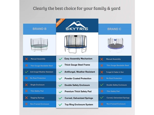 - Skytric Customer Service and Unbeatable Guarantee: Providing top-notch customer service is our #1 priority. We would be happy to assist in the event that you need help. Our backyard trampoline comes with 1-year warranty of jumping mats, frame & spring, and immediate replacement at zero cost, if anything is found defective
