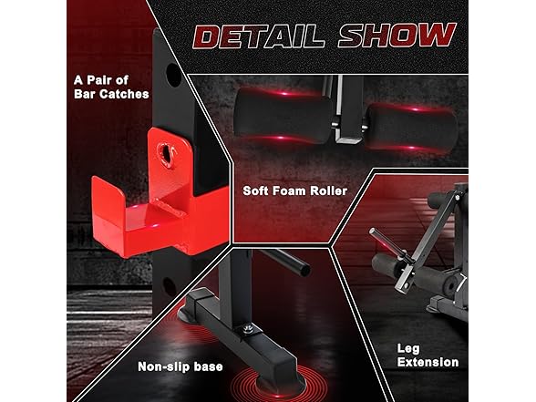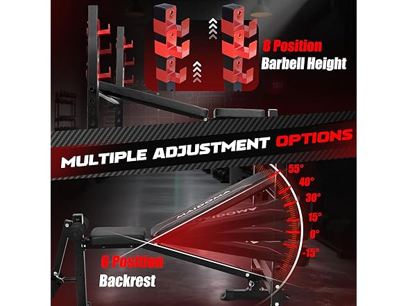 - 【Multi Angle Adjustable】 Customize every workout with 4-position backrest (flat/incline/decline) and 8-height barbell rack adjustments. Optimize incline bench angles for upper chest definition, decline sets for lower abs, or perfect shoulder press alignment – tailored for all body types and fitness goals.