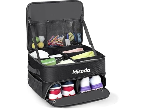 - VERSATILE DESIGN FOR TRUNK OR GARAGE:Foldable and portable, fits golf organizer for garage, golf trunk organizer for truck, golf bag wall mount, and golf caddy. Keep golf things for men organized and accessible anytime.