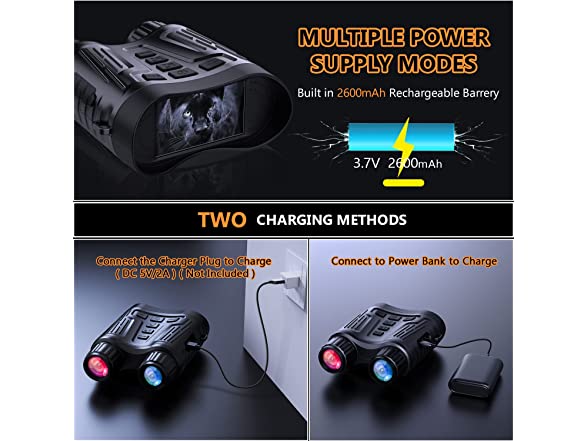 - Rechargeable Battery 2600mAh - This night vision binoculars have a powerful & rechargeable built-in lithium-ion, which allows you to view animals in complete darkness for 13h. Night vision scope can be charged with a power bank or car charger, saving money and being environmentally friendly.
