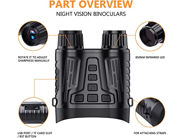 - Easy to use & widely used - 6 buttons can adjust multi-function. The operation is friendly to green hands. Night vision goggles can be your good helper in camping, night hunting gear/fishing/sailing, reconnaissance, security/surveillance, outdoor exploration, navigation, wildlife observation, cave adventure, courtyard monitoring, keep your property safe.
