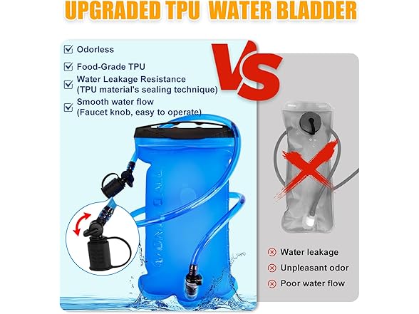- Leak-Proof Hydration: 2L TPU bladder with sealed edges prevents leaks and ensures pure taste for worry-free hydration on long trails