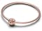 Celebrate the power of love with our Pandora Moments Encircled Clasp Bangle a shimmering statement piece plated with 14k rose gold. Featuring an encircled clasp the bangle is a symbol of infinite connections. The openwork design of the clasp with encircled lines on both sides is highlighted by a clear cubic zirconia and symbolically captures the essence of forever. Playfully versatile you can style it with up to 14-18 charms celebrating your lifes most important moments. This style features no threaders just smooth end caps to frame your favorite charms.