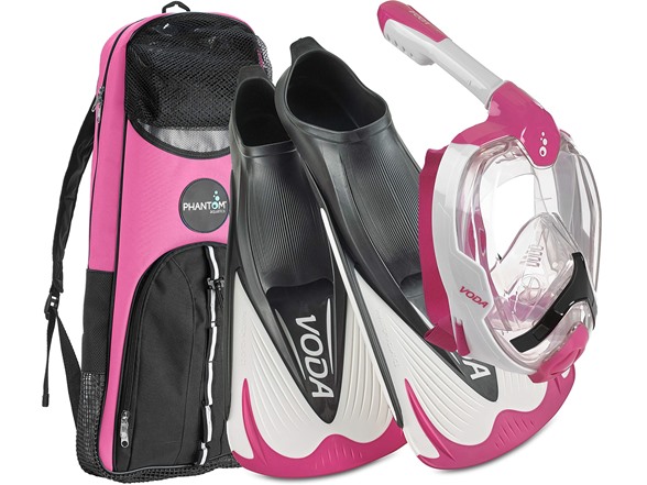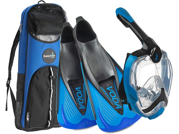- INCLUDES: Phantom Aquatics Italian Made Voda Full Foot Fins - Voda Panoramic View Full Face Mask with Dry Top Snorkel - Deluxe Snorkeling Gear Bag