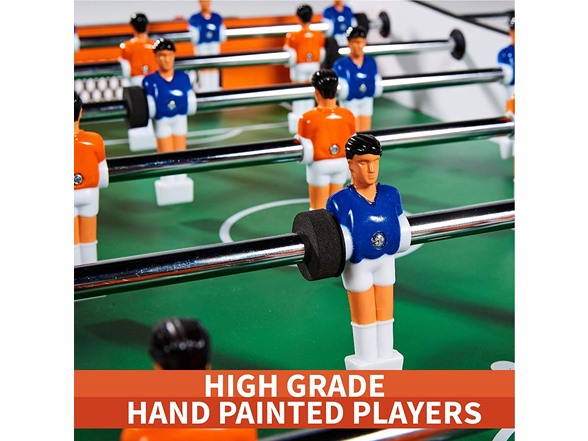 - Sturdy, Heavy-Duty: This stationary foosball board exemplifies superior, long-lasting build. With ½” diameter chrome-plated, steel rods and non-slip rubber handles, players always feel in control. It also includes 2 authentic foosballs.