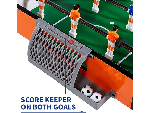 - (1) Rally and Roar Tabletop Foosball Mini Soccer Game, 2 Balls, 6 Player Rows and Built In Scoreboard