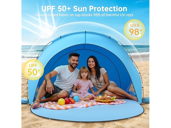 - Sun Protection & Water Resistance: Made of superior silver-coated fabric, this tent for beach offers UPF50+ sun protection, effectively blocking heat and 98% of harmful UV rays, keeping you safe from intense sunlight. The fabric boasts excellent waterproof performance, allowing you to enjoy a cool and dry leisure space during outdoor activities.