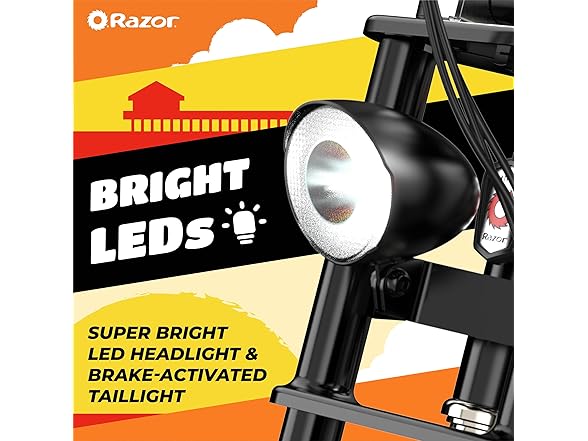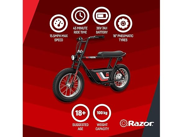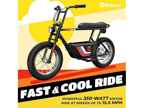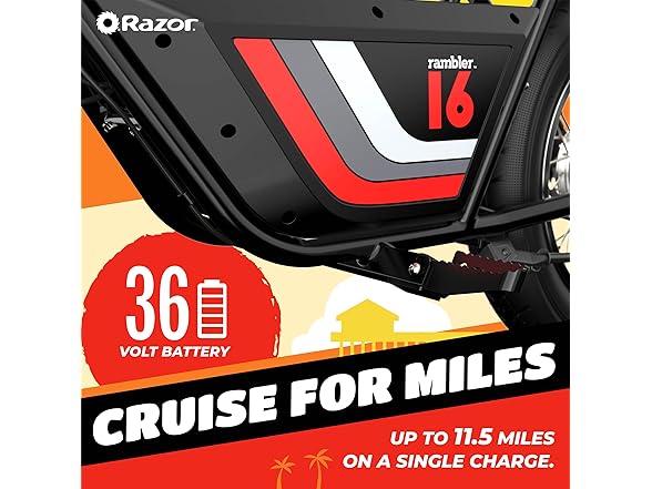 Get ready to ride in style. The new, retro-cool Razor Rambler 16 is part of the hot trend of minibikes. The powerful and quiet 350-watt, brushless hub motor lets you blast around town (local laws apply) at speeds up to 15.6 mph (25 km/h). It’s 36-volt battery system lets you cruise up to 11.5 miles (18.5 km). Take a seat on the elongated, banana-style seat and grab the riser-style handlebars to feel the freedom of riding. Whether the terrain is smooth or a bit rougher, the dual 16" (406 mm) super-wide, air-filled tires deliver a smooth and comfortable ride. For over 20 years, Razor has crafted awesome rides that set the standard for quality and performance. The Rambler 16 base has a finely tuned steel frame that is optimized for speed and handling. Featuring a super bright LED headlight and rear brake-activated taillight you will be shining bright coming or going. Super cool style, powerful motor, fat tires and retro graphics make the Rambler 16, THE retro cruiser to park in your garage, or better yet, get out and RIDE
