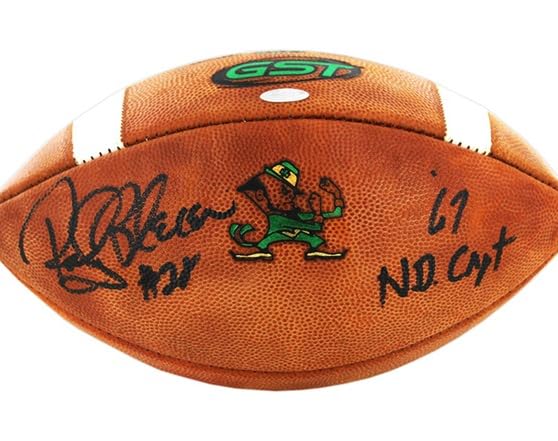 Rocky Bleier, a Notre Dame Fighting Irish Legend personally hand-signed this Notre Dame Game Model Football and inscribed it 67 ND Capt. No one expected it from looking at him in his youth, but Rocky Bleier went on to emerge as one of the best running backs of his era. Bleiers is a story of will, courage, and talent winning out over all obstacles. After a standout career at Notre Dame, Bleier was drafted by the Pittsburgh Steelers. Bleier worked his way back after returning from the U.S. Army and joined the Steelers where he helped lead them to four Super Bowl titles. This Rocky Bleier Autograph is guaranteed authentic and includes a Steiner Sports Certificate of Authenticity and an accompanying tamper-evident Steiner Hologram.