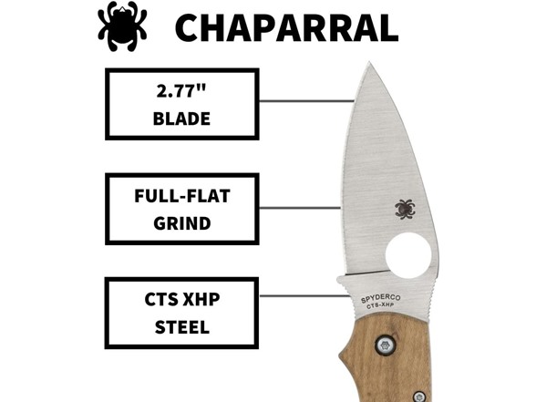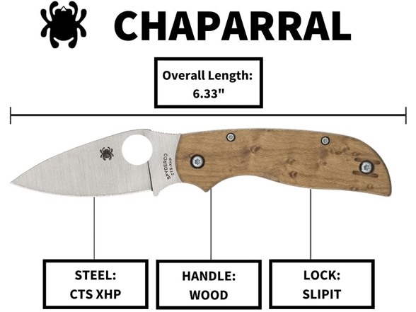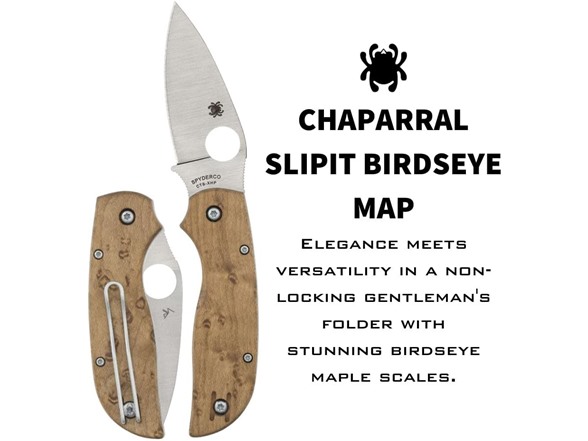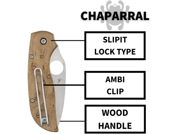 This beautiful Spyderco Birdseye Maple Wood Chaparral Slip-joint is handcrafted in Taiwan and comes with a Limited Lifetime Manufacturer's Warranty. New and never been used or re-sharpened, this gorgeous knife is 3 5/8 inches long (folded/closed) and weighs approximately 2.1 ounces. This knife utilizes a 2 7/8" Leaf Shaped blade with a plain edge, 2mm (0.079") thickness, full flat grind, thumb ramp, spine jimping, finger choil/guard, and a thumb hole. The blade material is CTS-XHP Stainless Steel with a Satin finish. The contoured handle is Birdseye Maple Wood with an ambidextrous reversible tip-up wire pocket clip. If you are looking for a great knife to collect, carry or give as a gift, don't pass this one up!