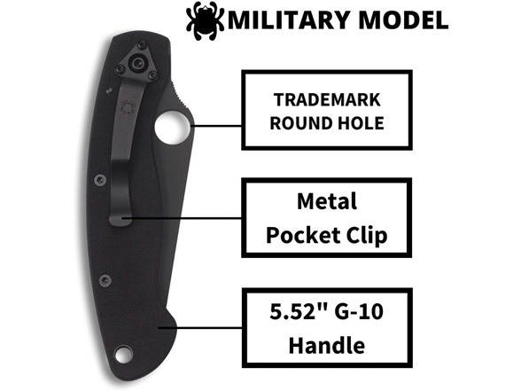 A cornerstone in Spyderco's Save and Serve line up, the Military Model came about after someone asked Spyderco's owner Sal Glesser, "If your son were going into the military what folding knife would you send him with?" For certain, it had to meet the requirements of a high-performance, light-weight folder designed for hard use. Since the steel is the spirit of the knife, CPM S30V and CPM S110V seemed the logical choice for the blade given its reputation for long-term edge retention and rust resistance. The 'Millie' has a modified clip-point blade laser cut with a 14 mm Spyderco Round Hole for quick deployment and for use with gloves. Texturing above the hole holds the thumb in contact with the blade's spine during cutting for confident control over the sharpened edge. The handle scales are G-10 with the lock's liner nested directly into the scale, pumping up lock strength without the addition of bulky liners. Spacers between the scales create a gap running the handle's full length exposing the inside workings for inspection and cleaning. The handle flares slightly at the front end creating a finger choil and at the butt end, keeps the knife from slipping forward or backward in the hand while sawing or making tough or aggressive cuts. A contoured black metal clip is set for right-hand tip-down carry.