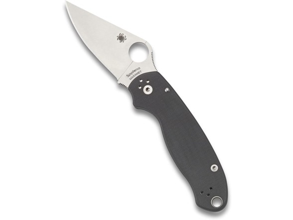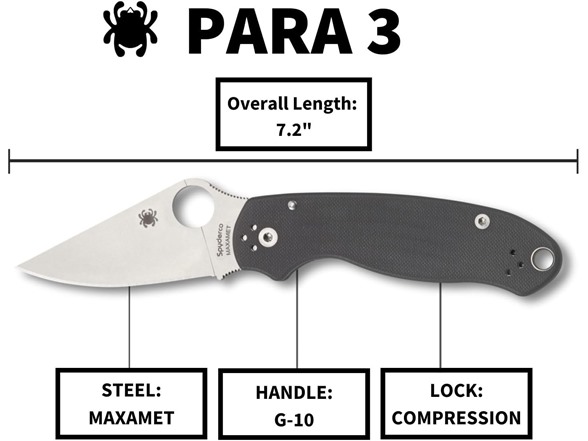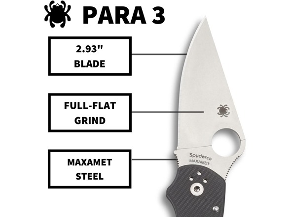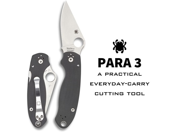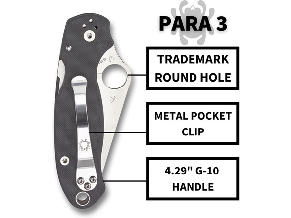 The Para 3 takes all the proven features and benefits of Spyderco's best-selling Para Military2 and distills them into an even more compact all-purpose cutting tool. Its three-inch blade is precision machined from steel and features a full-flat grind for a superior balance of strength, point utility, and low-friction cutting performance.To keep the Para 3 slim and pocket friendly, it features a lightweight, open-backed construction style and its steel liners are nested into machined recesses in the textured G-10 scales. This reduces the handle thickness and provides excellent structural support for the knife's patented Compression Lock. It includes a textured index-finger choil and thumb ramp that provide a solid purchase for a forward grip and offer enhanced control during precise cutting tasks. The blade's signature Round Hole clearly brands it as a member of the Spyderco family and is fully accessible to allow quick, positive, one-handed opening with either hand. Located in the spine of the handle, this high-strength mechanism locks the blade securely open during use, yet allows it to be closed easily and safely with only one hand. A four-position hourglass clip and an oversized lined lanyard hole complete the design. Ounce for once one of the most capable folding knives ever made, the Para 3 is destined to be a classic.