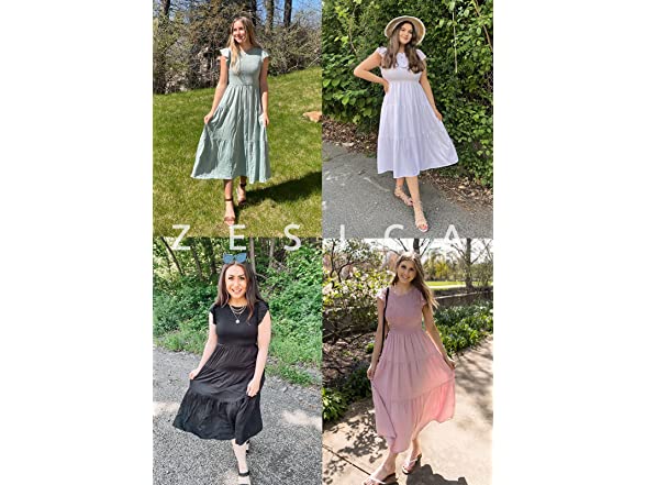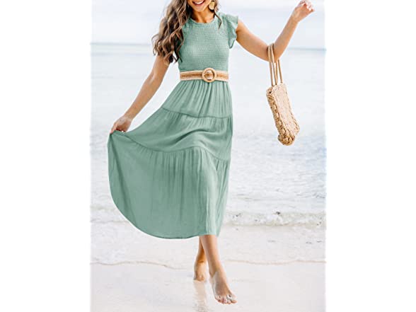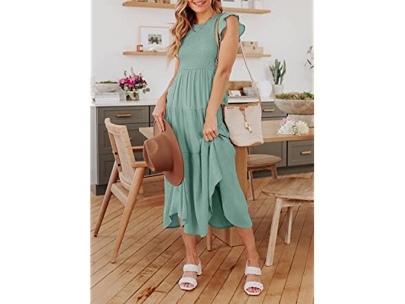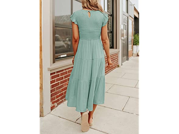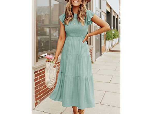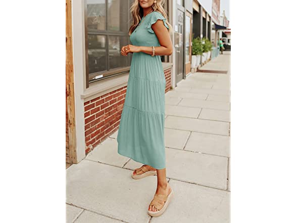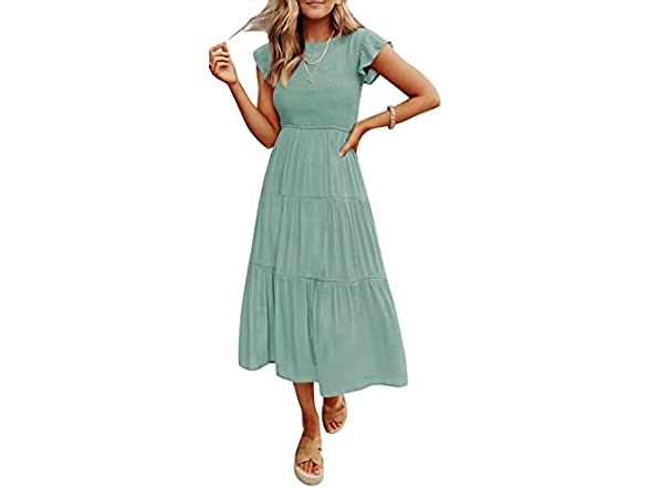 ZESICA Women's 2023 Summer Casual Flutter Short Sleeve Crew Neck Smocked Elastic Waist Tiered Midi Dress,Sage,Small