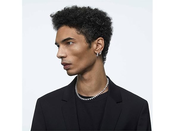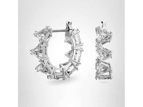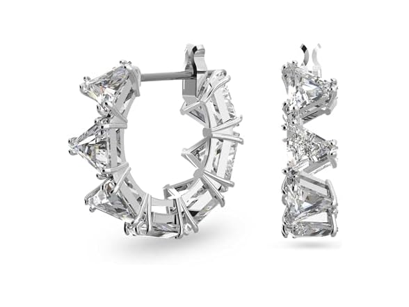 - Items delivered: (1) pair of Swarovski Matrix small hoop earrings, with white triangle-cut crystals on a rhodium plated setting, complete with a Swarovski earring box