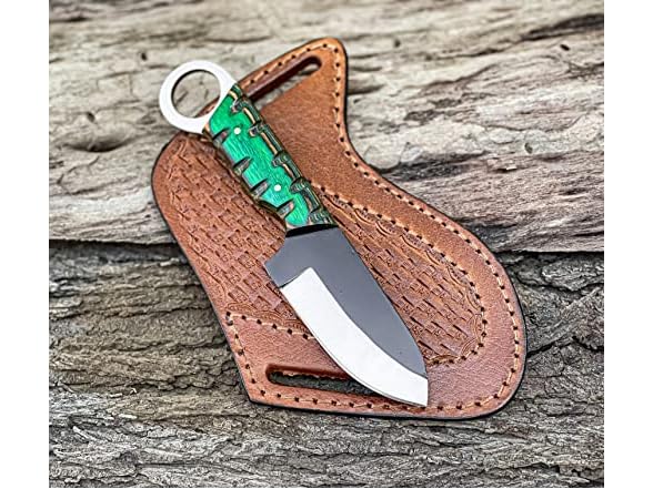 - Handle Material: Pakka Wood. Includes a hand stitched custom full-grain leather sheath with a belt loop
