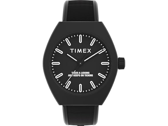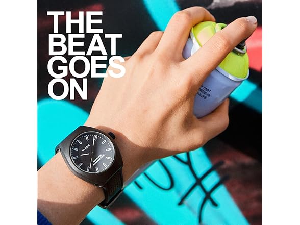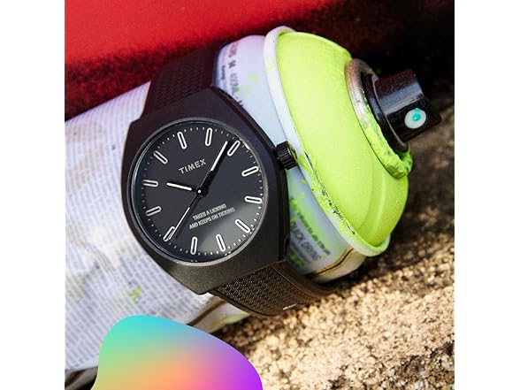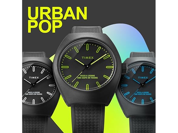 Our Urban Pop proves that sustainable fashion doesn’t have to skimp on quality or style. This watch keeps things sleek and clean with a sturdy 40mm eco-ceramic case made from a special blend of ceramic and bio-based resin derived from castor plants, paired with a subtly textured bio-based resin strap that’s comfortable and effortlessly cool. The minimalist dial with high-contrast markers proudly rocks the slogan “Takes a licking and keeps on ticking” as a shout-out to Timex’s legendary durability and an ode to our planet’s unwavering resilience.