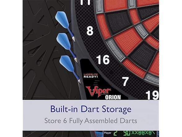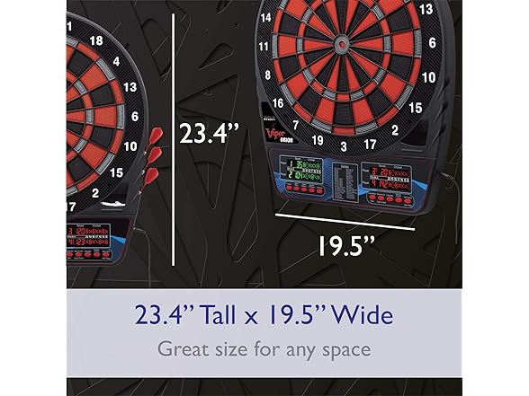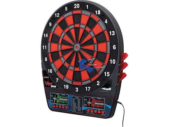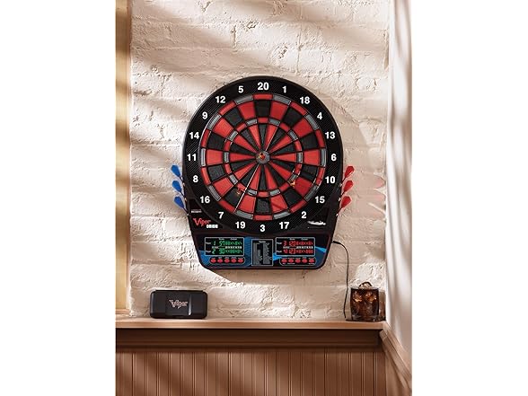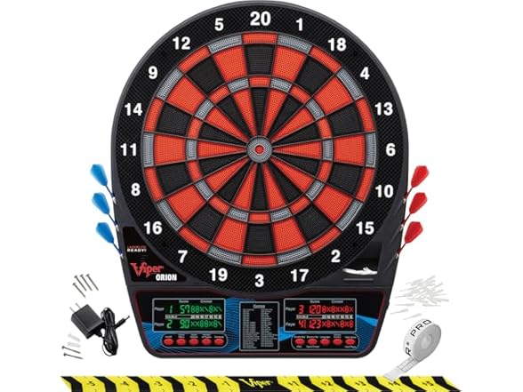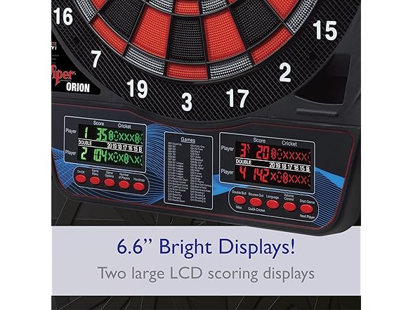 Who This Is For The Viper Orion is designed for recreational players and social hosts who want professional dartboard features at an accessible price point. This electronic dartboard is the perfect addition to a home game room, man cave, or garage, making it an ideal gift for families and adults who enjoy hosting multiplayer game nights without a major investment. How to Use Mount the dartboard to any wall using the included hardware and connect the AC adapter for consistent power. Select from 43 games using the front-facing buttons, or press the dedicated Cricket quickplay button to start competing in seconds. The dual LCD displays automatically track scores for up to 8 players while the impact-tough nylon segments withstand your toughest throws. Product Dimensions 23.4 in L x 19.4 in W x 0.7 in H | Weight: 5 lbs